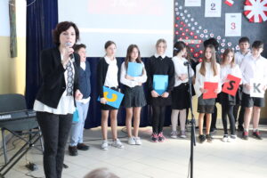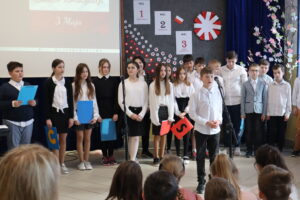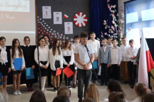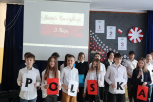 Dnia 28 kwietnia 2023r. w naszej szkole odbył się uroczysty apel z okazji święta uchwalenia Konstytucji 3 Maja.  Aby upamiętnić ten doniosły fakt z historii Polski, klasa V pod opieką swego wychowawcy pana Tomasza Kirtiklisa i przy wsparciu muzycznym pani Iwony Pabianek przygotowała i zaprezentowała całej społeczności szkolnej montaż słowno-muzyczny o patriotycznej wymowie. Uroczystość rozpoczęto wprowadzeniem sztandaru oraz odśpiewaniem hymnu państwowego. Zaprezentowano historię uchwalenia konstytucji, jej znaczenie i twórców. Stało się to świetną okazją do przypomnienia wszystkim obecnym na apelu ważnych faktów z historii Polski i pozwoliło uzmysłowić, jak ważną rolę i znaczenie mają słowa: Ojczyzna i Patriotyzm. Nie zabrakło także odświętnych strojów i wyeksponowania naszych symboli narodowych a to wszystko w starannie przygotowanej przez panią Dorotę Wojtkowską i Milenę Maćkowiak- Cudowską  scenografii.