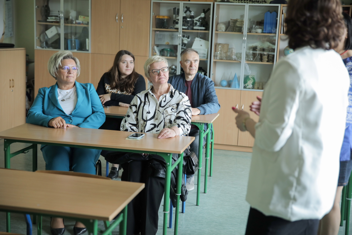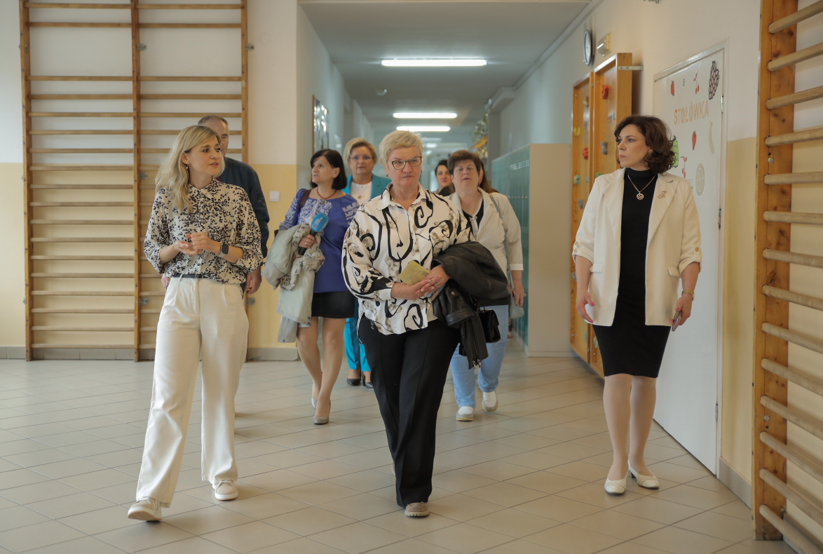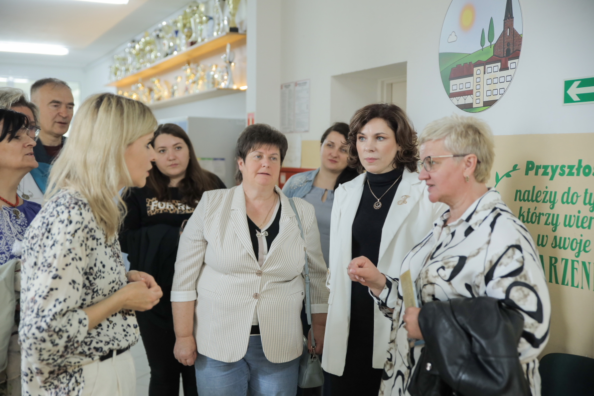 Pani dyrektor opowiedziała gościom o polskim systemie edukacji oraz o naszym Zespole. Pokazała pracownie i wyposażenie. Wspomniała o realizowanych projektach i po krótce opowiedziała o stosowanych w szkole i przedszkolu metodach pracy.