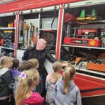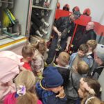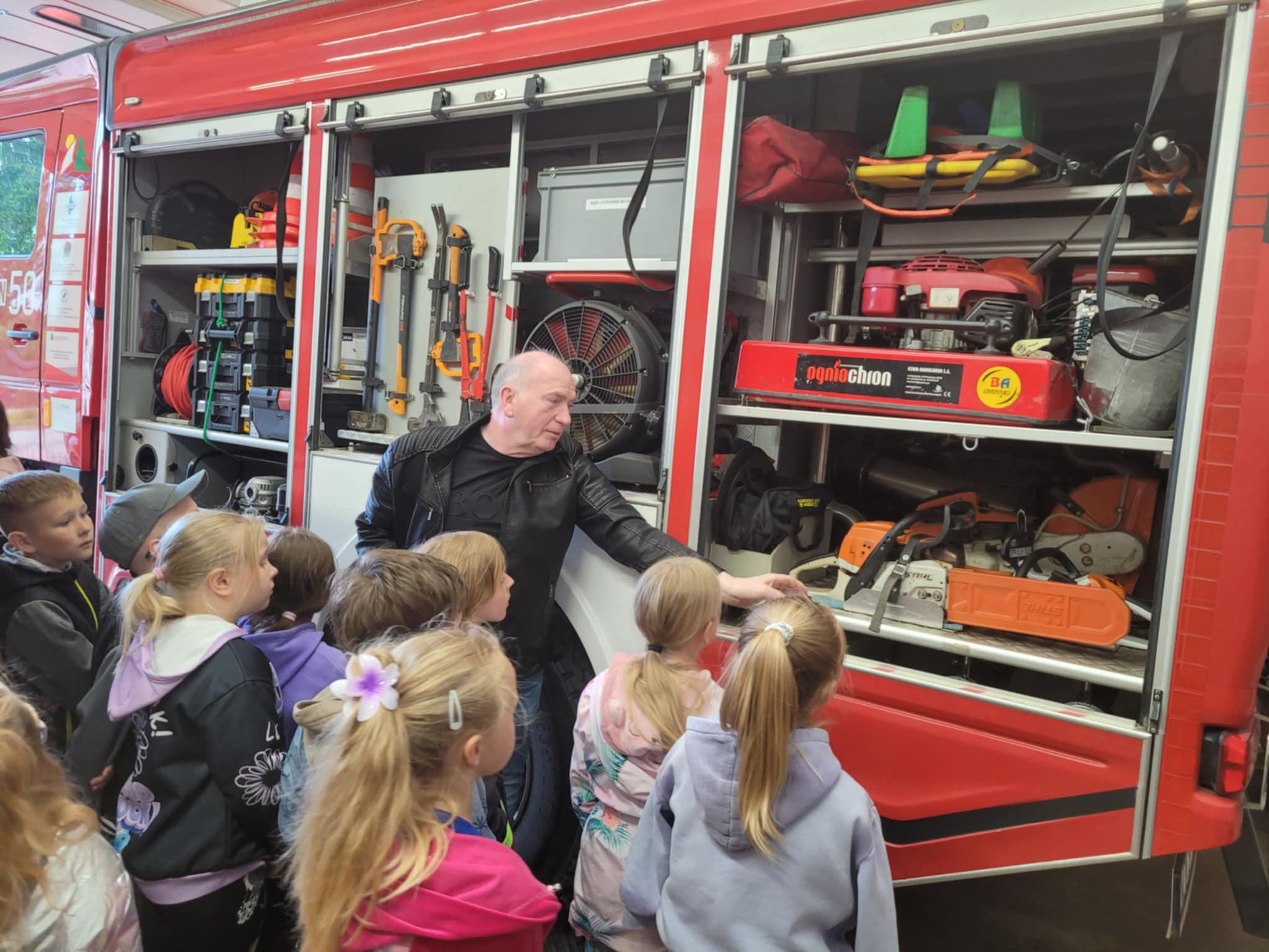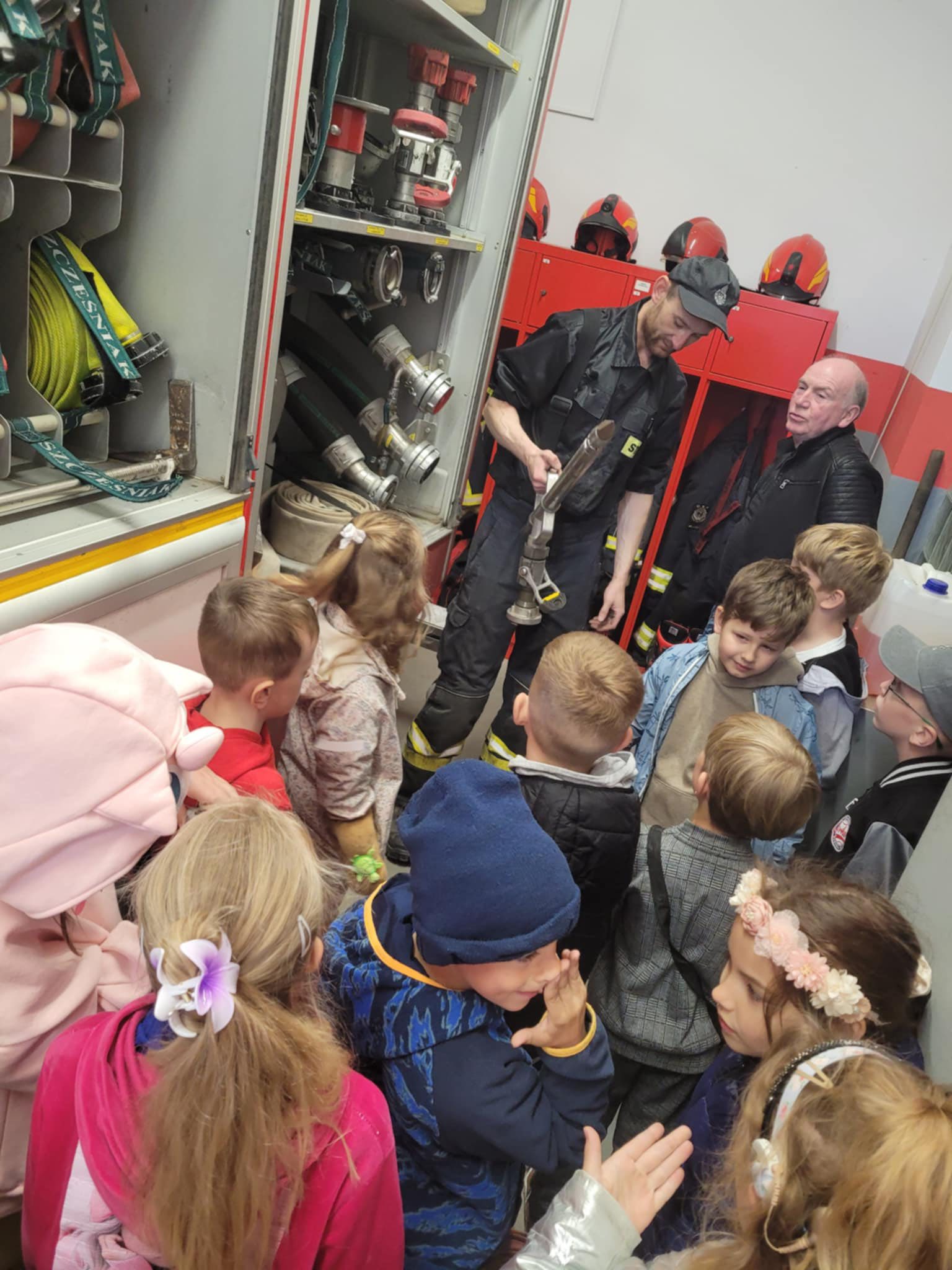 Korzystając z wizyty w remizie strażackiej uczniowie nie mogli się oprzeć pokusie zgłębienia wiedzy na temat wyposażenia wozu strażackiego oraz poznania tajników pracy strażaka.